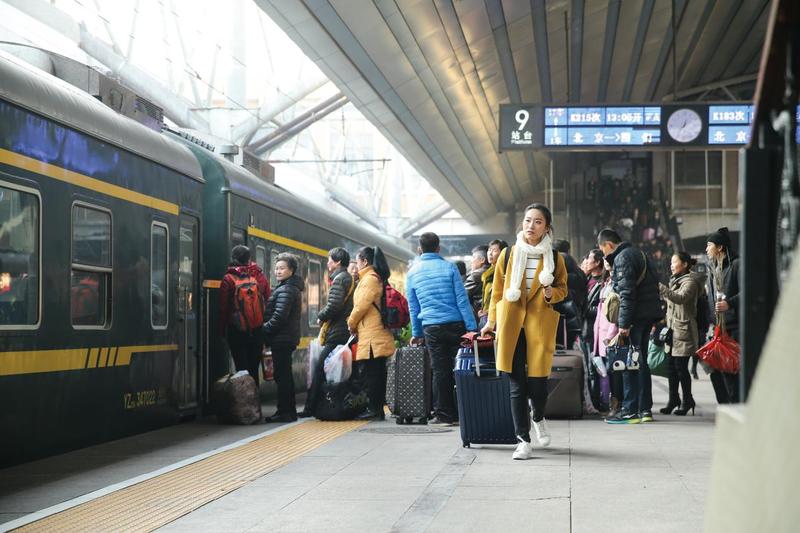春运期间,众多返乡者有序排队,登上驶向家乡的绿皮火车。(图片来源:图虫)