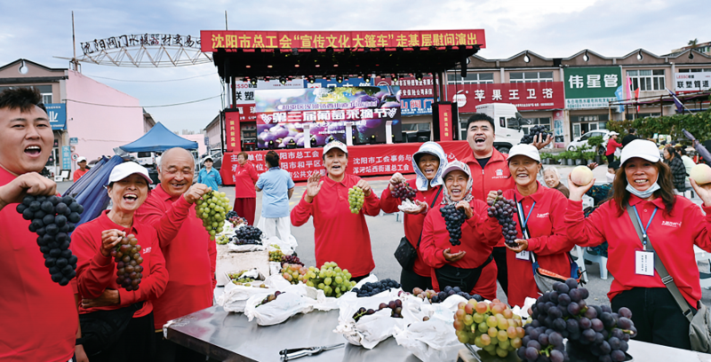 奔波有了回报——葡萄节开幕当天,下河湾村村委会不仅与多家企业达成长期合作意向,还现场卖出1500余公斤葡萄,销售额超3万元;同时,和平区总工会帮村里对接电商平台,并通过“沈阳e工会”APP等平台直播带货,当天售出500余公斤葡萄,销售收入1万余元。
